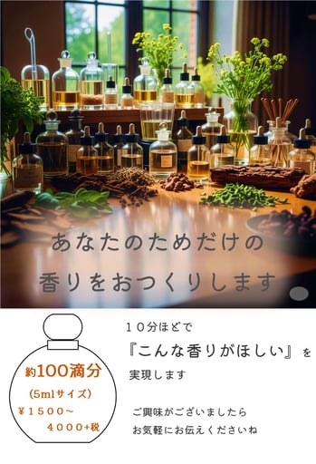 植物のめぐみ『精油』を約100種ある中から数種ブレンドして香りをおつくりします。